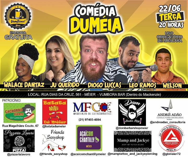 Eles vão brincar com histórias engraçadas da região do Méier, Rio de Janeiro mas também situações do dia a dia, que todos passam, sempre de forma hilária! Terça, dia 22/06, o VUMBORA BAR, dentro do Sport Club Mackenzie recebe a “Comédia Duméia”, um show de Stand Up Comedy produzido e comandando por Digo Luccas, que se diz um “Não Bobéiênse de Plantão”.